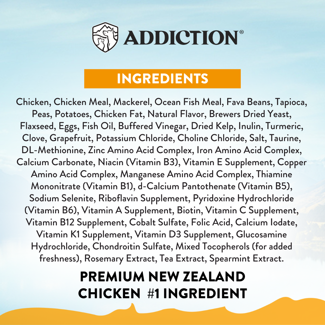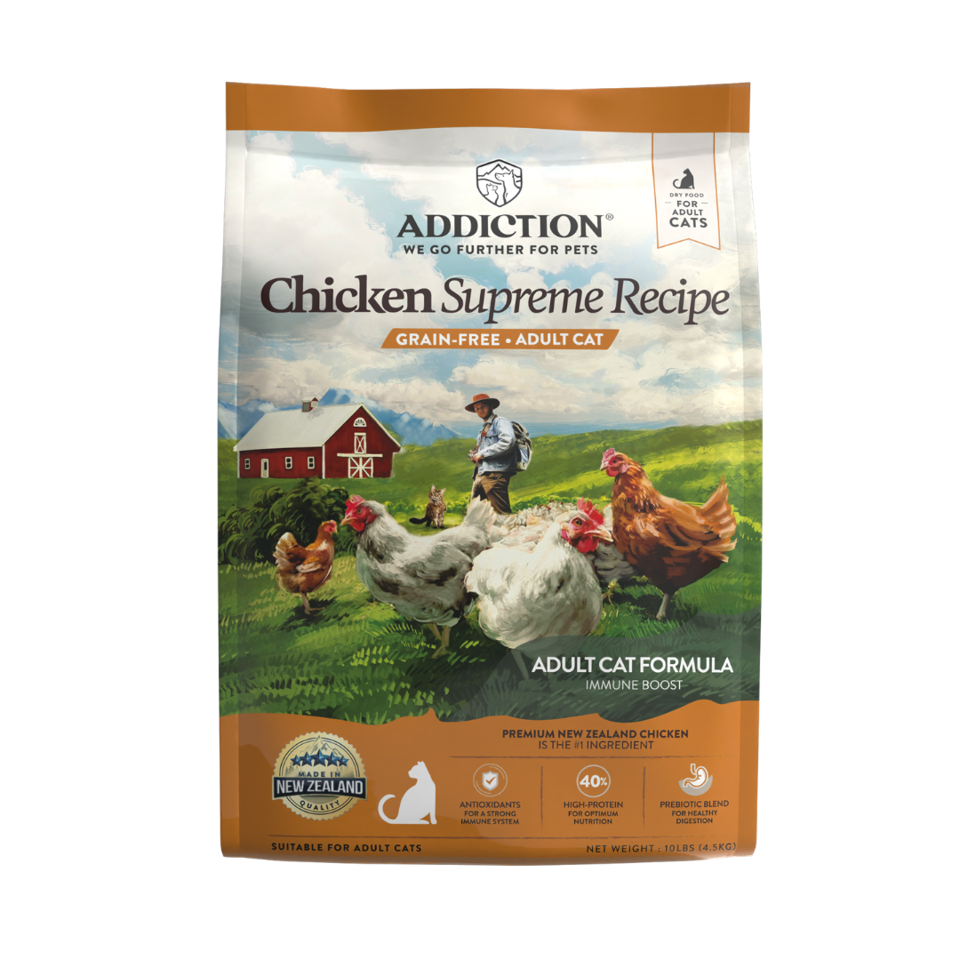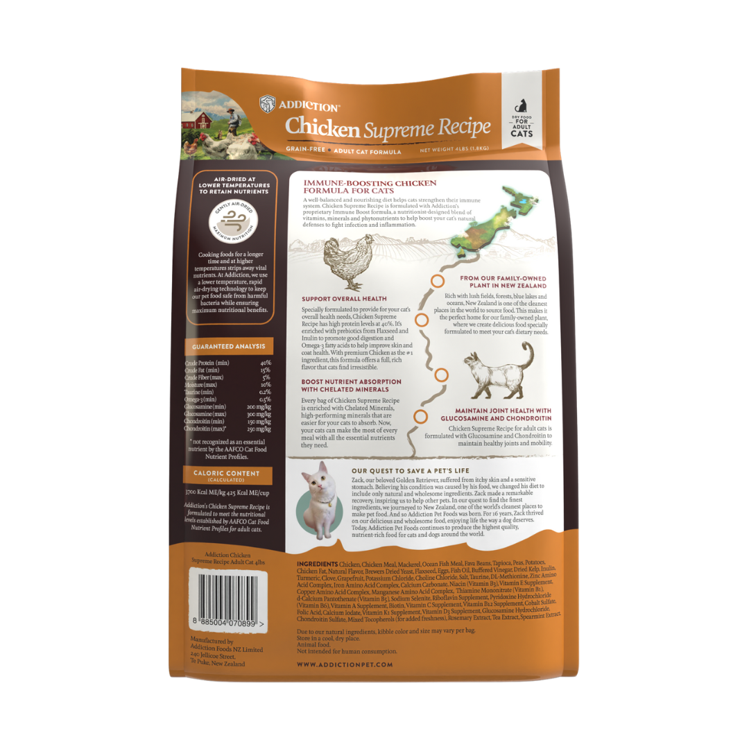 Addiction's Chicken Supreme Recipe for Adult Cats is crafted with premium New Zealand chicken as the #1 ingredient, delivering a protein-rich, grain-free diet that supports your cat’s overall health and vitality. Enhanced with a proprietary Immune Boost formula, this recipe combines essential vitamins, minerals, and phytonutrients to strengthen immunity, while prebiotics from flaxseed and inulin promote optimal digestion. With added glucosamine and chondroitin for joint health, omega fatty acids for skin and coat, and no artificial additives, this complete and balanced meal is designed to keep your cat thriving every day.