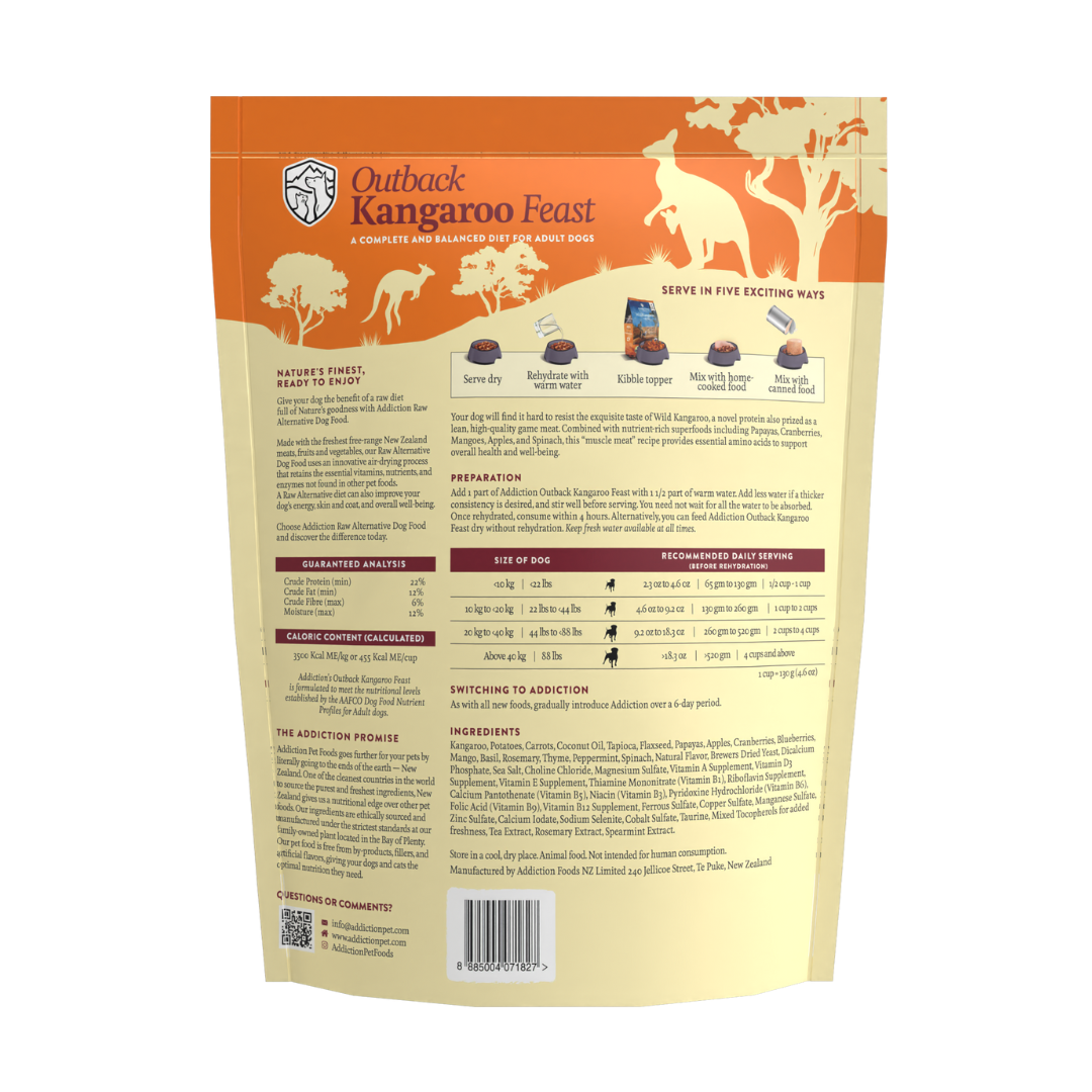 Your dog will find it hard to resist the exquisite taste of Wild Kangaroo, a novel protein also prized as a lean, high-quality game meat. Outback Kangaroo Feast stands out with its distinctive ‘meat-muesli’ texture—a hearty blend of wild Australian kangaroo and vibrant superfoods. This innovative format delivers a satisfying, nutrient-dense meal that appeals to even the pickiest eaters. Its versatility allows you to serve it dry, rehydrate with warm water for a softer meal, or use it as a topper to enhance your dog’s regular food. This recipe is complete and balanced for adult dogs, but works as a topper for all life stages. Perfect for dogs with food sensitivities, this recipe is both delicious and gentle on digestion.
