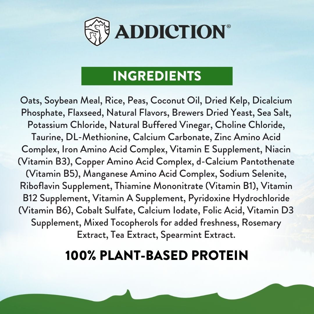Oats, Soybean Meal, Rice, Peas, Coconut Oil, Dried Kelp, Dicalcium Phosphate, Flaxseed, Natural Flavor, Brewers Dried Yeast, Sea Salt, Potassium Chloride, Natural Buffered Vinegar, Choline Chloride, Taurine, DL-Methionine, Calcium Carbonate, Zinc Amino Acid Complex, Iron Amino Acid Complex, Vitamin E Supplement, Niacin (Vitamin B3), Copper Amino Acid Complex, d-Calcium Pantothenate (Vitamin B5), Manganese Amino Acid Complex, Sodium Selenite, Riboflavin Supplement, Thiamine Mononitrate (Vitamin B1), Vitamin B12 Supplement, Vitamin A Supplement, Pyridoxine Hydrochloride (Vitamin B6), Cobalt Sulfate, Calcium Iodate, Folic Acid, Vitamin D3 Supplement, Mixed Tocopherols for added freshness, Rosemary Extract, Tea Extract, Spearmint Extract