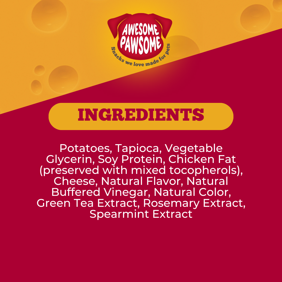 Potatoes, Tapioca, Vegetable Glycerin, Soy Protein, Chicken Fat (preserved with mixed tocopherols), Cheese, Natural Flavor, Natural Buffered Vinegar, Natural Color, Green Tea Extract, Rosemary Extract, Spearmint Extract.​