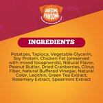 Potatoes, Tapioca, Vegetable Glycerin, Soy Protein, Chicken Fat (preserved with mixed tocopherols), Natural Flavor, Peanut Butter, Dried Cranberries, Citrus Fiber, Natural Buffered Vinegar, Natural Color, Lecithin, Green Tea Extract, Rosemary Extract and Spearmint Extract
