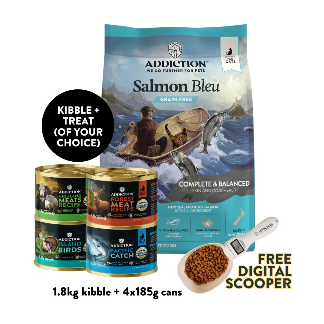 From the depths of New Zealand’s bluest oceans, Addiction Salmon Bleu brings the finest king salmon straight to your pet’s bowl.