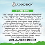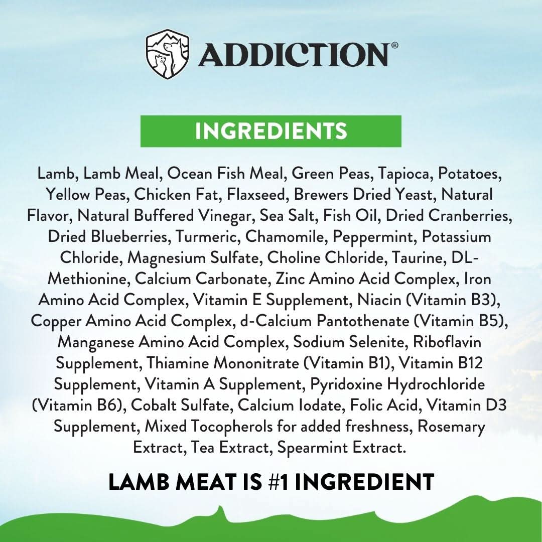 Lamb, Lamb Meal, Ocean Fish Meal, Green Peas, Tapioca, Potatoes, Yellow Peas, Chicken Fat, Flaxseed, Brewers Dried Yeast, Natural Flavor, Natural Buffered Vinegar, Sea Salt, Fish Oil, Dried Cranberries, Dried Blueberries, Turmeric, Chamomile, Peppermint, Potassium Chloride, Magnesium Sulfate, Choline Chloride, Taurine, DL-Methionine, Calcium Carbonate, Zinc Amino Acid Complex, Iron Amino Acid Complex, Vitamin E Supplement, Niacin (Vitamin B3), Copper Amino Acid Complex, d-Calcium Pantothenate (Vitamin B5), Manganese Amino Acid Complex, Sodium Selenite, Riboflavin Supplement, Thiamine Mononitrate (Vitamin B1), Vitamin B12 Supplement, Vitamin A Supplement, Pyridoxine Hydrochloride (Vitamin B6), Cobalt Sulfate, Calcium Iodate, Folic Acid, Vitamin D3 Supplement, Mixed Tocopherols for added freshness, Rosemary Extract, Tea Extract, Spearmint Extract.